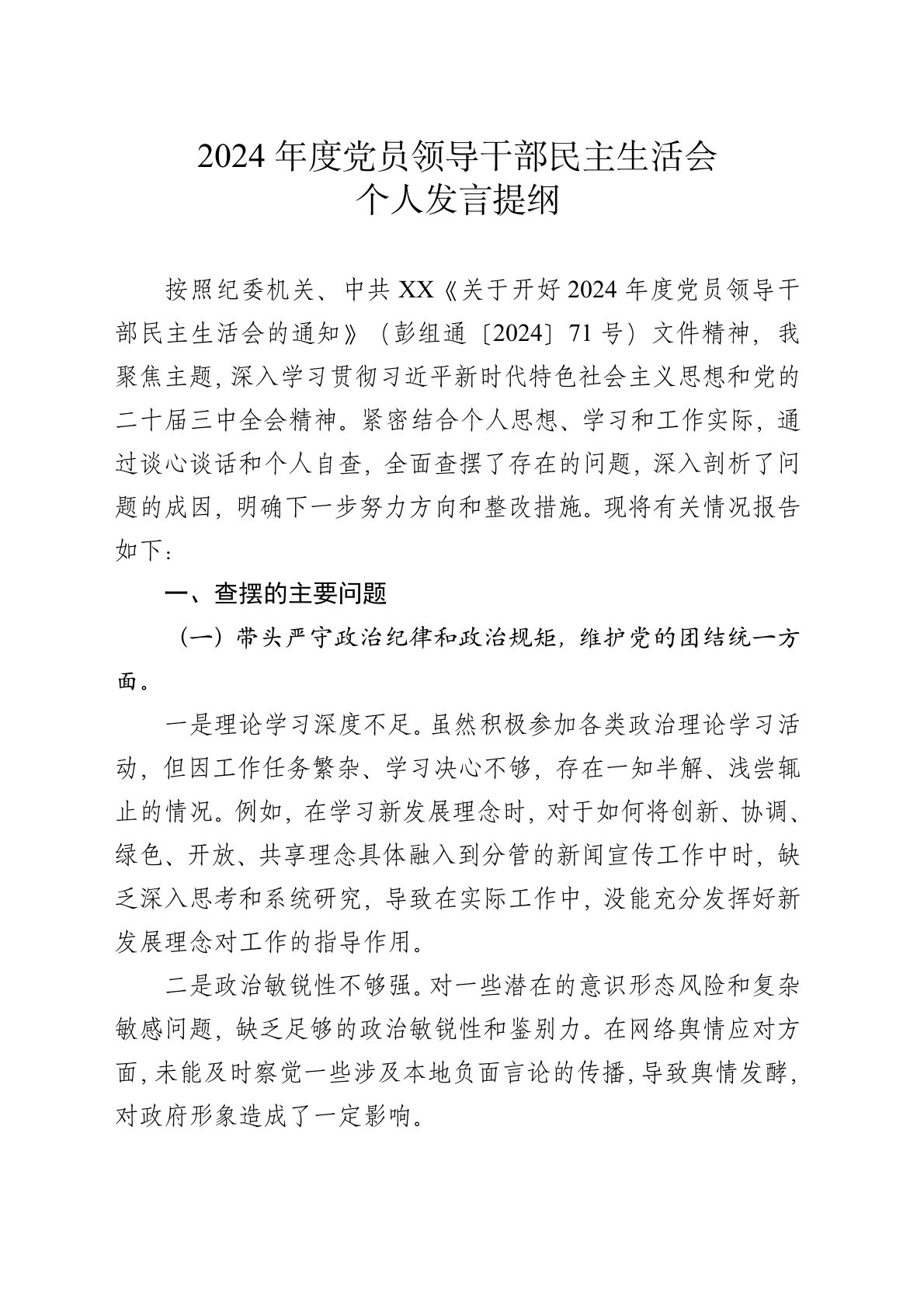 2024年度黨員領(lǐng)導(dǎo)干部民主生活會(huì)個(gè)人發(fā)言提綱