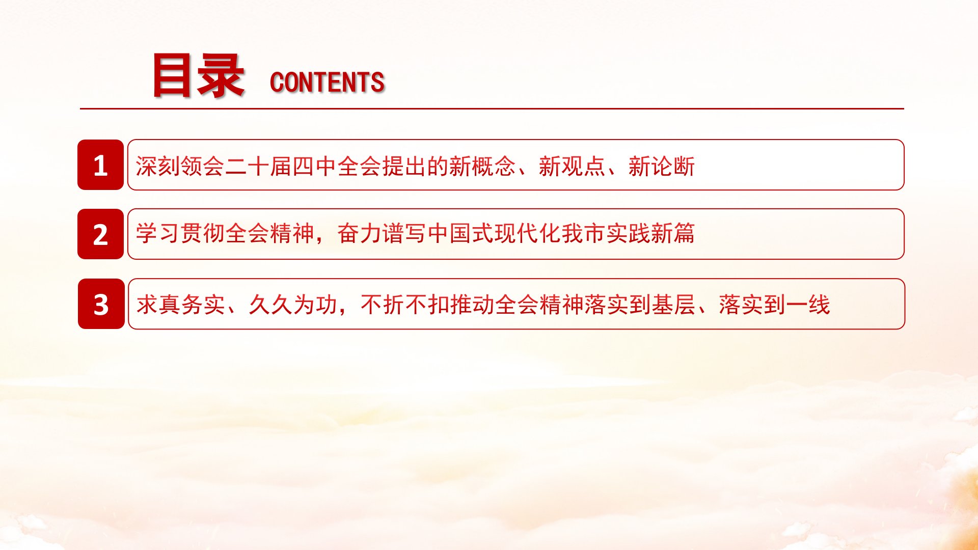 深刻領會二十屆四中全會提出的新概念、新觀點、新論斷,奮力譜寫中國式現(xiàn)代化我市實踐新篇前言10月23日,黨的二十屆四中全會公報發(fā)布。公報中提出了一系列新概念、新觀點、新論斷。這些新概念、新觀點、新論斷,高瞻遠矚、思想深刻、內(nèi)涵豐富,深刻總結(jié)了“十四五”時期我國發(fā)展取得的非凡成就,指明了“十五五”時期我國經(jīng)濟社會發(fā)展的方向。我們要深刻領會,學習好、宣傳好、貫徹好全會精神,奮力譜寫中國式現(xiàn)代化我市實踐新篇。目錄CONTENTS123深刻領會二十屆四中全會提出的新概念、新觀點、新論斷第一部分全黨要深刻領悟“兩個確立”的決定性意義,增強“四個意識”、堅定“四個自信”、做到“兩個維護”,保持戰(zhàn)略定力,增強...