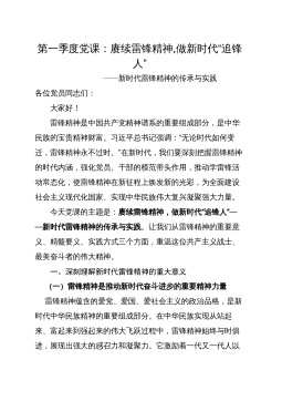 第一季度黨課:賡續(xù)雷鋒精神,做新時(shí)代“追鋒人”——新時(shí)代雷鋒精神的傳承與實(shí)踐各位黨員同志們:大家好!雷鋒精神是中國(guó)共產(chǎn)黨精神譜系的重要組成部分,是中華民族的寶貴精神財(cái)富。習(xí)近平總書(shū)記強(qiáng)調(diào):“無(wú)論時(shí)代如何變遷,雷鋒精神永不過(guò)時(shí)?!痹谛聲r(shí)代,我們要深刻把握雷鋒精神的時(shí)代內(nèi)涵,強(qiáng)化黨員、干部的模范帶頭作用,推動(dòng)學(xué)雷鋒活動(dòng)常態(tài)化,使雷鋒精神在新征程上煥發(fā)新的光彩,為全面建設(shè)社會(huì)主義現(xiàn)代化國(guó)家、實(shí)現(xiàn)中華民族偉大復(fù)興凝聚強(qiáng)大力量。今天黨課的主題是:賡續(xù)雷鋒精神,做新時(shí)代“追鋒人”——新時(shí)代雷鋒精神的傳承與實(shí)踐。讓我們從雷鋒精神的重要意義、精髓要義、實(shí)踐方式三個(gè)方面,重溫這位共產(chǎn)主義戰(zhàn)士、最美奮斗者的偉大精...