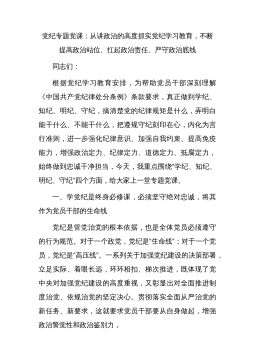 黨紀(jì)學(xué)習(xí)教育專題黨課講稿匯編(3篇)目錄1.學(xué)黨紀(jì)筑牢規(guī)矩“防火墻”,心存敬畏,使守紀(jì)律、講規(guī)矩成為行動(dòng)自覺22.從講政治的高度抓實(shí)黨紀(jì)學(xué)習(xí)教育,不斷提高政治站位、扛起政治責(zé)任、嚴(yán)守政治底線133.從《條例》修訂看如何全面加強(qiáng)紀(jì)律建設(shè)24學(xué)黨紀(jì)筑牢規(guī)矩“防火墻”,心存敬畏,使守紀(jì)律、講規(guī)矩成為行動(dòng)自覺同志們,經(jīng)黨中央同意,自2024年4月至7月在全黨開展黨紀(jì)學(xué)習(xí)教育。這次黨紀(jì)學(xué)習(xí)教育,是加強(qiáng)黨的紀(jì)律建設(shè)、推動(dòng)全面從嚴(yán)治黨向縱深發(fā)展的重要舉措。心有所戒,行有所止。作為黨員干部,不管在什么崗位,都應(yīng)當(dāng)把紀(jì)律挺在前面,時(shí)刻繃緊紀(jì)律之弦、筑牢作風(fēng)之堤,在講規(guī)矩中干好事、在守紀(jì)律中干成事,把遵守黨的政治...