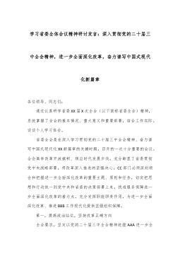 學(xué)習(xí)省委全體會議精神研討發(fā)言:深入貫徹黨的二十屆三中全會精神,進(jìn)一步全面深化改革,奮力譜寫中國式現(xiàn)代化新篇章各位領(lǐng)導(dǎo)、同志們: 通過認(rèn)真研學(xué)省委XX屆X次全會(以下簡稱省委全會)精神,系統(tǒng)掌握了全會的基本情況、重大意義和重要部署,結(jié)合工作實(shí)際,談?wù)剛€(gè)人學(xué)習(xí)體會?! ∈∥珪窃谏钊雽W(xué)習(xí)貫徹黨的二十屆三中全會精神、奮力譜寫中國式現(xiàn)代化XX新篇章的關(guān)鍵時(shí)期,召開的一次十分重要的會議。全會高舉改革開放旗幟、順應(yīng)時(shí)代發(fā)展步伐,充分彰顯了省委貫徹黨中央戰(zhàn)略部署,將改革深入推進(jìn)的堅(jiān)強(qiáng)決心。CC部門必須深刻領(lǐng)會和把握進(jìn)一步全面深化改革的重要主題、原則和任務(wù),切實(shí)把思想和行動(dòng)統(tǒng)一到黨中央和省委的決策部署上來...