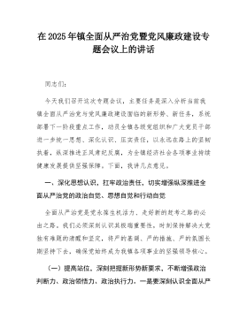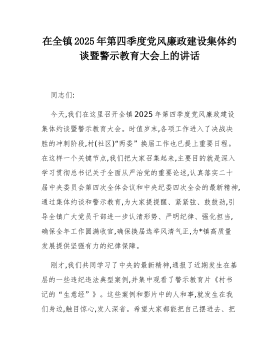 在全鎮(zhèn)2025年第四季度黨風(fēng)廉政建設(shè)集體約談暨警示教育大會(huì)上的講話同志們:今天,我們?cè)谶@里召開全鎮(zhèn)2025年第四季度黨風(fēng)廉政建設(shè)集體約談暨警示教育大會(huì)。時(shí)值歲末,各項(xiàng)工作進(jìn)入了決戰(zhàn)決勝的沖刺階段,村(社區(qū))“兩委”換屆工作也已提上重要日程。在這樣一個(gè)關(guān)鍵節(jié)點(diǎn),我們把大家召集起來,主要目的就是深入學(xué)習(xí)貫徹總書記關(guān)于全面從嚴(yán)治黨的重要論述,認(rèn)真落實(shí)二十屆中央委員會(huì)第四次全體會(huì)議和中央紀(jì)委四次全會(huì)的最新精神,通過集體約談和警示教育,為大家提提醒、緊緊弦、鼓鼓勁,引導(dǎo)全鎮(zhèn)廣大黨員干部進(jìn)一步認(rèn)清形勢、嚴(yán)明紀(jì)律、強(qiáng)化擔(dān)當(dāng),確保全年工作圓滿收官,確保換屆選舉風(fēng)清氣正,為*鎮(zhèn)高質(zhì)量發(fā)展提供堅(jiān)強(qiáng)有力的紀(jì)律保障。...