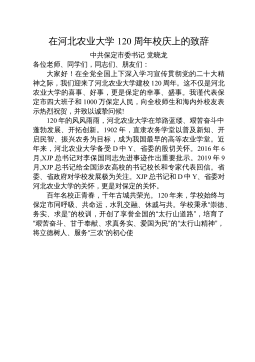 在河北農(nóng)業(yè)大學(xué)120周年校慶上的致辭中共保定市委書記黨曉龍各位老師、同學(xué)們,同志們、朋友們:大家好!在全黨全國上下深入學(xué)習(xí)宣傳貫徹黨的二十大精神之際,我們迎來了河北農(nóng)業(yè)大學(xué)建校120周年。這不僅是河北農(nóng)業(yè)大學(xué)的喜事、好事,更是保定的幸事、盛事。我謹(jǐn)代表保定市四大班子和1000萬保定人民,向全校師生和海內(nèi)外校友表示熱烈祝賀,并致以誠摯問候!120年的風(fēng)風(fēng)雨雨,河北農(nóng)業(yè)大學(xué)在篳路藍(lán)縷、艱苦奮斗中蓬勃發(fā)展、開拓創(chuàng)新。1902年,直隸農(nóng)務(wù)學(xué)堂以普及新知、開啟民智、振興農(nóng)務(wù)為目標(biāo),成為我國最早的高等農(nóng)業(yè)學(xué)堂。近年來,河北農(nóng)業(yè)大學(xué)備受D中Y、省委的殷切關(guān)懷。2016年6月,習(xí)近平總書記對李保國同志先進(jìn)事跡...