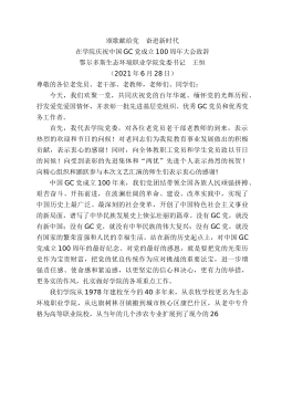 頌歌獻(xiàn)給黨奮進(jìn)新時(shí)代在學(xué)院慶祝中國(guó)GC黨成立100周年大會(huì)致辭鄂爾多斯生態(tài)環(huán)境職業(yè)學(xué)院黨委書(shū)記王恒(2021年6月28日)尊敬的各位老黨員、老干部、老教師,老師們、同學(xué)們:今天,我們歡聚一堂,共同慶祝黨的百年華誕、緬懷黨的光輝歷程、抒發(fā)愛(ài)黨愛(ài)國(guó)情懷,并表彰一批先進(jìn)基層黨組織、優(yōu)秀GC黨員和優(yōu)秀黨務(wù)工作者。首先,我代表學(xué)院黨委,對(duì)各位老黨員老干部老教師的到來(lái),表示熱烈的歡迎和節(jié)日的問(wèn)候!對(duì)老同志們?yōu)槲以航逃聵I(yè)發(fā)展做出的積極貢獻(xiàn),表示衷心的感謝!同時(shí),向全體教職工黨員和學(xué)生黨員致以節(jié)日的問(wèn)候!向受到表彰的先進(jìn)集體和“兩優(yōu)”先進(jìn)個(gè)人表示熱烈的祝賀!向精心組織和踴躍參與本次文藝匯演的師生們表示衷心的...