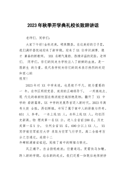 2023年秋季開學(xué)典禮校長(zhǎng)致辭講話尊敬的各位老師、親愛的同學(xué)們:早上好!歡迎同學(xué)們返校!特別是我們美麗的XX高中大家庭迎來(lái)了習(xí)近平多名新高一的同學(xué)們,我謹(jǐn)代表全體師生員工,祝賀你們!歡迎你們!你們將在XX高中開啟人生的新征程,借此機(jī)會(huì),向伴隨你們一路拼搏成長(zhǎng)的父母、老師表示誠(chéng)摯的問候和衷心的感謝!過去一年,在莞外師生的共同努力下,我們又向前邁進(jìn)了一步,在各方面都取得了不錯(cuò)的成績(jī)。第一,上學(xué)年我校高考、中考及非畢業(yè)班的聯(lián)考都取得了非常好的成績(jī)。莞外高考優(yōu)投率達(dá)XX%,本科率達(dá)XX%,均又有了新的提升。XX等一大批優(yōu)秀畢業(yè)生被香港中文大學(xué)、哈爾濱工業(yè)大學(xué)、南開大學(xué)、中山大學(xué)、山東大學(xué)等名校錄取,他...