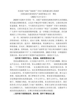 在高霍產(chǎn)業(yè)園“創(chuàng)新杯”年輕干部朗誦比賽上的致辭合肥高新區(qū)霍邱現(xiàn)代產(chǎn)業(yè)園管委會(huì)主任傅壯(2021年2月2日)2020年是極不尋常的一年,高霍產(chǎn)業(yè)園的發(fā)展既有始料未及的挑戰(zhàn),更有超出預(yù)期的驚喜,正是在不確定性中把握了確定性,讓我們體會(huì)到征途漫漫,惟有奮斗。今天我們?cè)谶@里舉行“創(chuàng)新杯”年輕干部朗誦比賽活動(dòng),主要目的是為了深入學(xué)習(xí)合肥市“兩會(huì)”會(huì)議精神,展現(xiàn)園區(qū)廣大青年干部開(kāi)拓創(chuàng)新的精神面貌,進(jìn)一步增強(qiáng)工作的緊迫感、責(zé)任感使園區(qū)上下同心同向,為建設(shè)更高水平的高霍產(chǎn)業(yè)園區(qū)而共同努力。這一年,園區(qū)被列入全省首批18個(gè)長(zhǎng)三角省際產(chǎn)業(yè)合作示范區(qū)。經(jīng)濟(jì)持續(xù)向好,經(jīng)營(yíng)收入、進(jìn)出口總額、稅收收入均實(shí)現(xiàn)三位數(shù)增長(zhǎng);基...