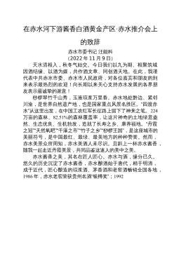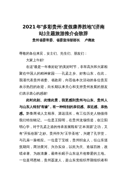 省委宣傳部部長在2023“多彩XX”文旅宣傳推廣暨招商推介會上的致辭女士們、先生們、朋友們:大家下午好!“春風(fēng)如貴客,一到便繁華”。在這個惠風(fēng)和暢、萬物復(fù)蘇、春色醉人的美好時節(jié),我們與各位新老朋友相聚在美麗的世界名城上海,共同舉辦2023年多彩XX文旅宣傳推廣暨招商推介會,向大家發(fā)出“山地公園省喜迎貴客、多彩XX風(fēng)再添華彩”的盛情邀約。在此,受徐麟書記、李炳軍省長委托,我謹(jǐn)代表XX省委、省政府,向蒞臨本次活動的各位領(lǐng)導(dǎo)、各位嘉賓表示熱烈的歡迎,向長期以來關(guān)心支持XX發(fā)展的各界朋友表示衷心的感謝!大家知道,XX的“母親河”烏江是長江上游南岸最大的支流;而上海地處長江和黃浦江入海匯合處,正是長江“...