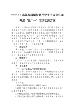 中共XX高等專(zhuān)科學(xué)校委員會(huì)關(guān)于規(guī)范扎實(shí)開(kāi)展“三個(gè)一”活動(dòng)實(shí)施方案根據(jù)《中國(guó)共產(chǎn)黨巡視工作條例》《黨委(黨組)落實(shí)全面從嚴(yán)治黨主體責(zé)任規(guī)定》和市委巡察整改工作流程指引試點(diǎn)要求,按照市委第二巡察組《關(guān)于巡察期間進(jìn)一步規(guī)范扎實(shí)開(kāi)展“三個(gè)一”活動(dòng)的通知》部署要求,經(jīng)研究決定,自2025年5月26日起,開(kāi)展“三個(gè)一”活動(dòng)(召開(kāi)一次全面從嚴(yán)治黨會(huì)議、開(kāi)展一次專(zhuān)題調(diào)研活動(dòng)、解決一批立行立改問(wèn)題)。特制定本方案。一、活動(dòng)目的通過(guò)開(kāi)展“三個(gè)一”活動(dòng),進(jìn)一步提高政治站位,強(qiáng)化政治擔(dān)當(dāng),切實(shí)履行黨委主體責(zé)任,全面提升管黨治黨水平,推動(dòng)全面從嚴(yán)治黨向縱深發(fā)展。二、組織領(lǐng)導(dǎo)“三個(gè)一”活動(dòng)在市委第二巡察組指導(dǎo)下,在學(xué)校黨...
